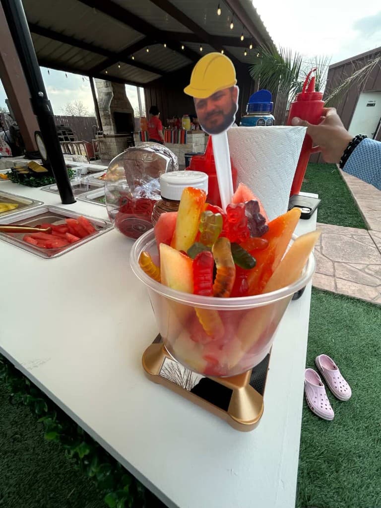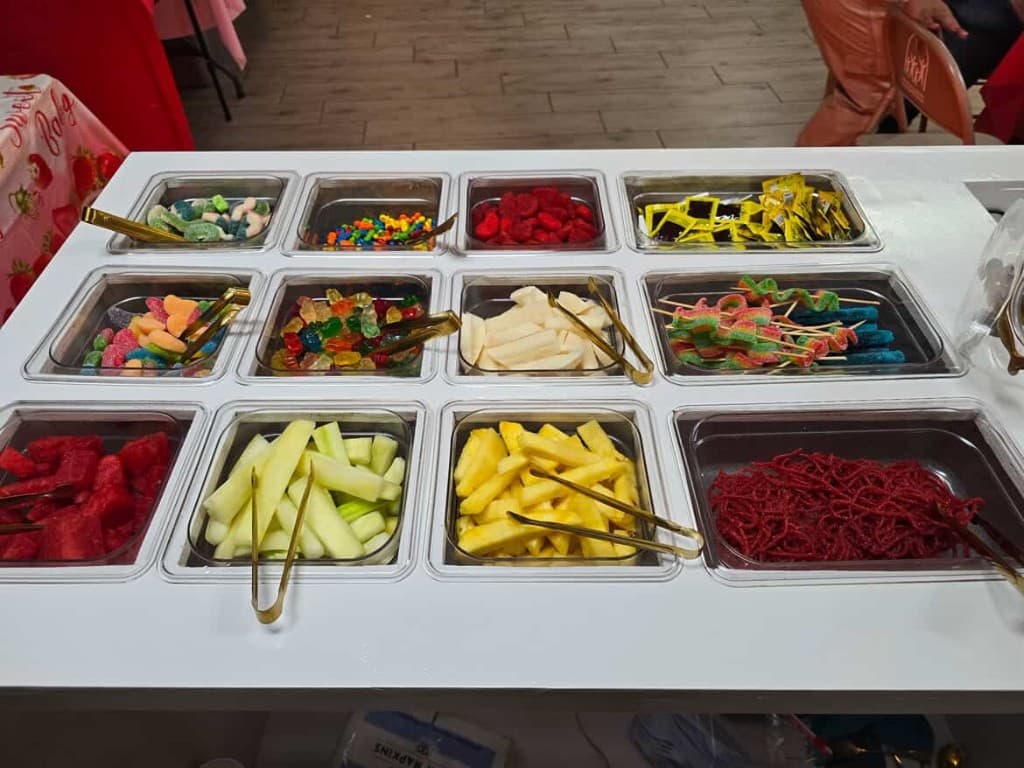 Snack carts, fruit treats, fresh aguas, fun characters — plus baby shower animations (baby showers only). We run the station so you can enjoy the party.