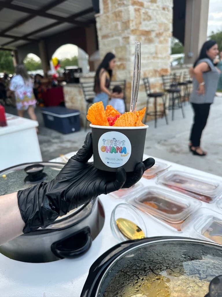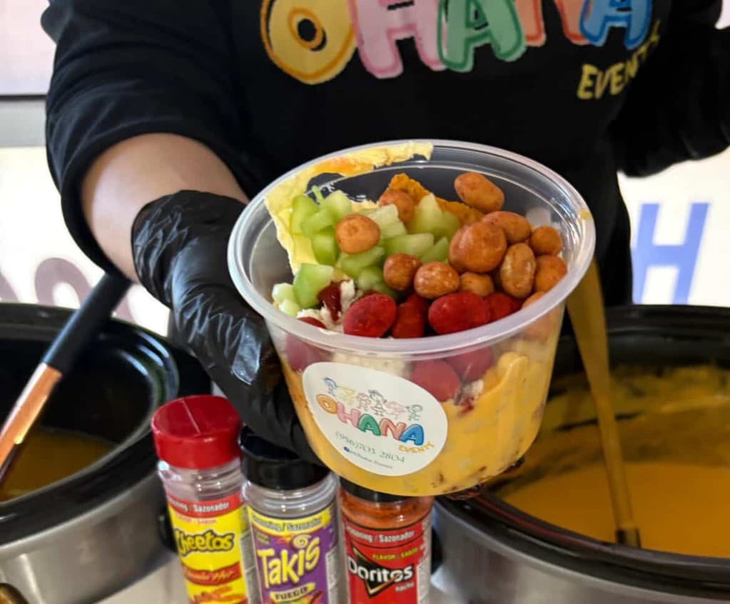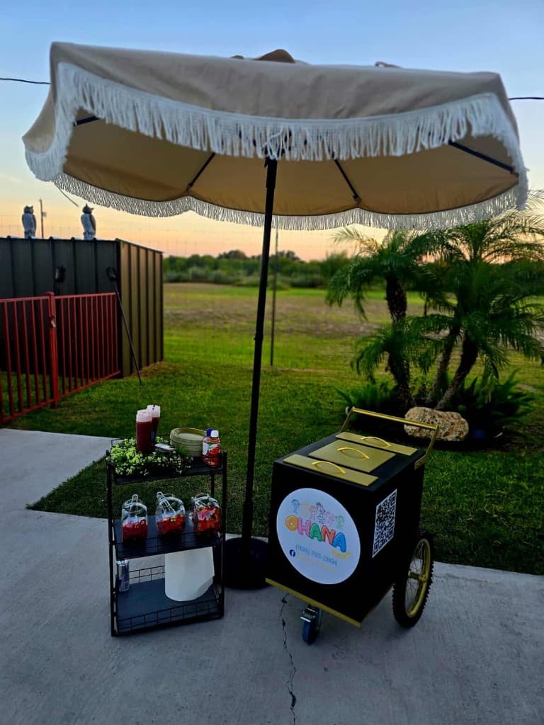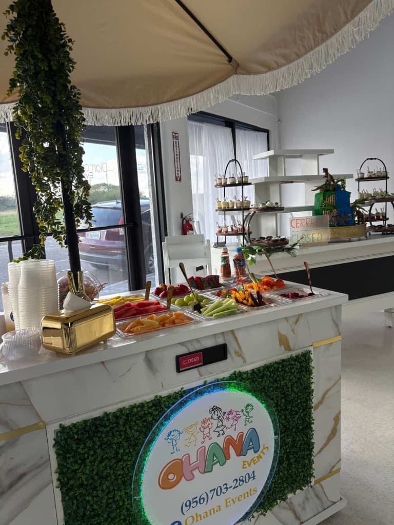 Snack carts, fruit treats, fresh aguas, fun characters — plus baby shower animations (baby showers only). We run the station so you can enjoy the party.
